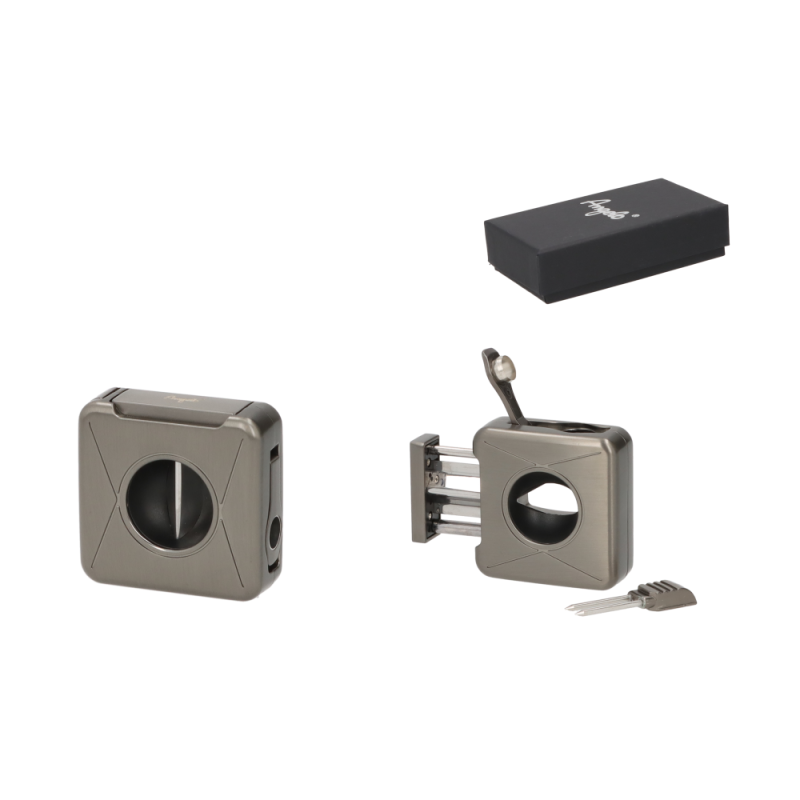 Μεταλλικός κόφτης πούρων της Angelo V-Cut από ανοξείδωτο ατσάλι, σε matte gunmetal χρώμα, δαχτυλίδι μέχρι 56, με ενσωματωμένο punch και cigar draw.