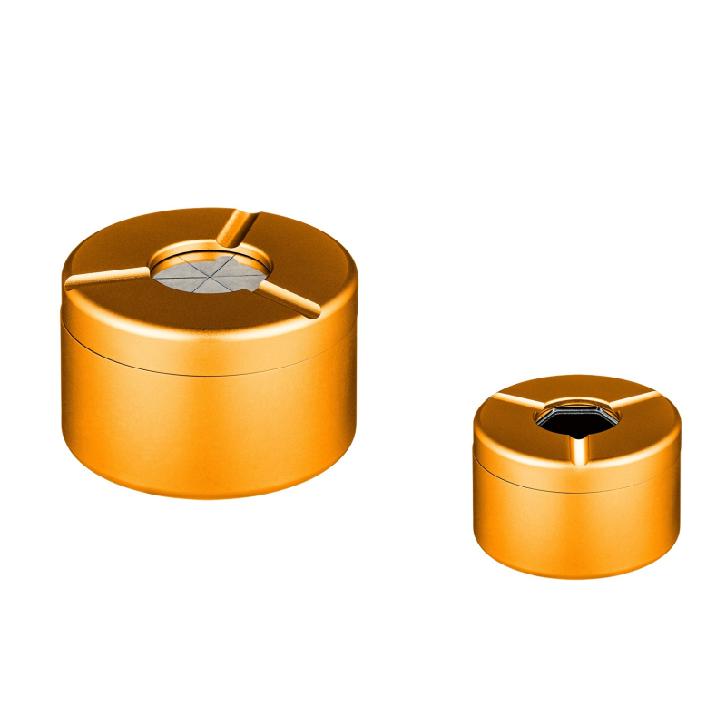 Τασάκι αλουμινίου της Angelo σε χρυσό για τρία τσιγάρα, κλείνει περιστρέφοντας το πάνω μέρος και διάμετρο 8cm.