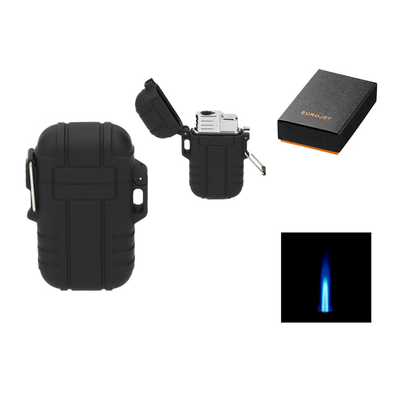 Αναπτήρας Eurojet σε μαύρο χρώμα από πλαστικό, με μια jet φλόγα, λαβή ασφαλείας, επαναγεμιζόμενος και ρύθμιση της έντασης της φλόγας.