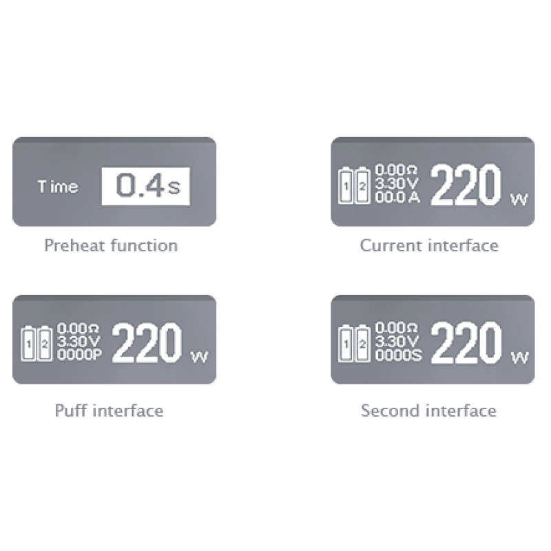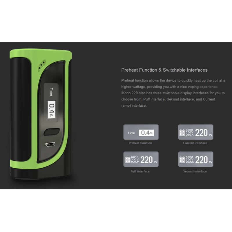 Τροφοδοτείται από δύο 18650 μπαταρίες (Δεν συμπεριλαμβάνονται) το iKonn 220 είναι ικανό να εξάγει μια μέγιστη ισχύ των 220W, παρέχοντας σας μια μεγάλη παραγωγή ατμού.Το iKonn 220 έρχεται με μια μεγάλη οθόνη 0,91 ιντσών που προσφέρει μια συνοπτική και σαφή διασύνδεση με διπλή μπαταρία αντίστοιχα αποκαλύπτοντας τα επίπεδα της μπαταρίας των δύο 18650 . 2Α ρεύμα φόρτισης για γρήγορη φόρτιση με μέγιστο 2Α ρεύμα φόρτισης, οι μπαταρίες μπορούν να φορτιστούν πλήρως πολύ πιο γρήγορα.