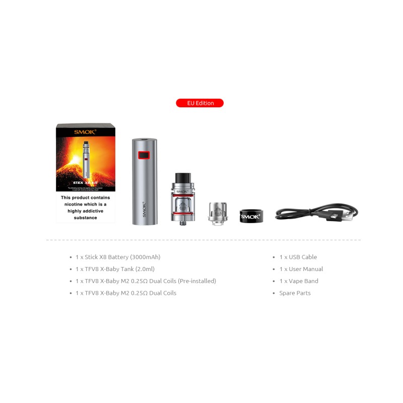 Το Stick X8 kit είναι το νεότερο αρχικό πακέτο τύπου "στυλό" από την Smok. Πολύ δυνατή απόδοση λόγο του TFV8 X-Baby, μεγάλη αυτονομία με την ενσωματωμένη μπαταρία των 3000mAh και σταθερή απόδοση...πάει τα Starter Kits στο επόμενο επίπεδο! Το X8 Stick διαθέτει μεγάλη μπαταρία 3000mAh ώστε να καλύψει ακόμα και τους πιο απαιτητικούς ατμιστές. Μετά από κάθε τζούρα το λαμπάκι στο "fire button" αναβοσβήνει 4 φορές, όταν αναβοσβήνει 15 φορές γρήγορα σημαίνει ότι η στάθμη της μπαταρίας είναι κάτω από 3.3V και χρειάζεται φόρτιση. Το X8 Kit διαθέτει όλες τις απαραίτητες προστασίες!