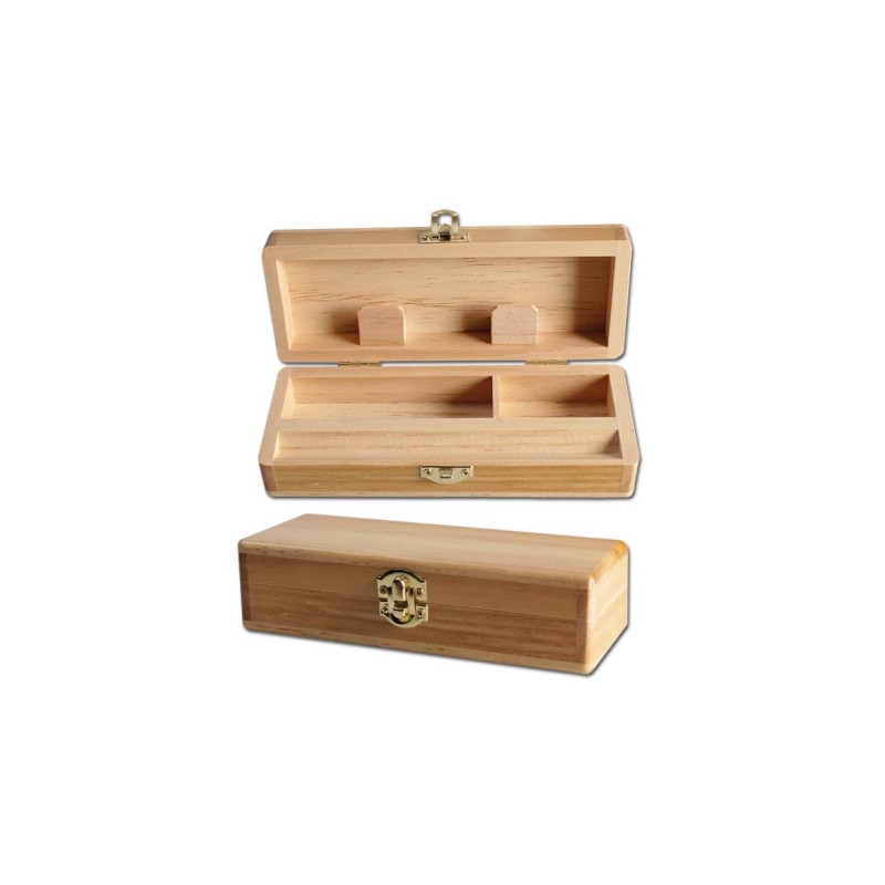 Ξύλινο κουτί με στρογγυλεμένες εγκοπές και χώρο για αξεσουάρ και είδη καπνιστού, όπως καπνό, φίλτρα και αναπτήρας.